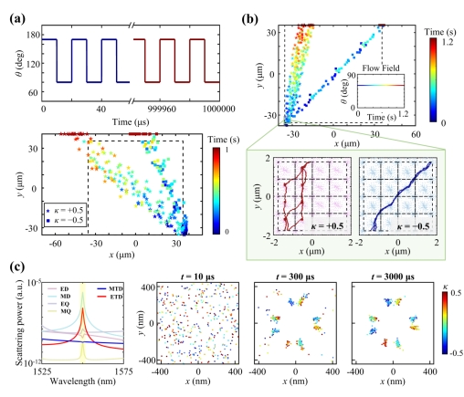 The positions and shapes of the potential wells differ for each enantiomer, causing two types of particles to exhibit distinct motion behaviors under the same flow field. Moreover, due to the asymmetric distribution of potential wells across the structure, the motion of the particles is also influenced by the angle of the flow field. Based on this principle, the research team designed a periodically modulated fluid field, as shown in Figure 2(a). The fluid velocity is set to 800 μm/s, with the angle periodically switching between 80° and 170°. A stream of 20 nm chiral particles flows through the sorting area, which consists of 80 × 80 periodic metasurface structures. At the outlet, the minimum separation distance between the two types of particles reaches 32 μm. As shown in Figure 2(b), chiral sorting of 200 nm particles is achieved under a constant flow field, with a minimum separation distance of 48 μm. Additionally, static separation of 20 nm chiral particles is also demonstrated in separated potential wells, as shown in Figure 2(c). Theoretical calculations indicate that this method can be further extended to high-speed sorting of larger or smaller particles, as well as particles with different chirality factors.