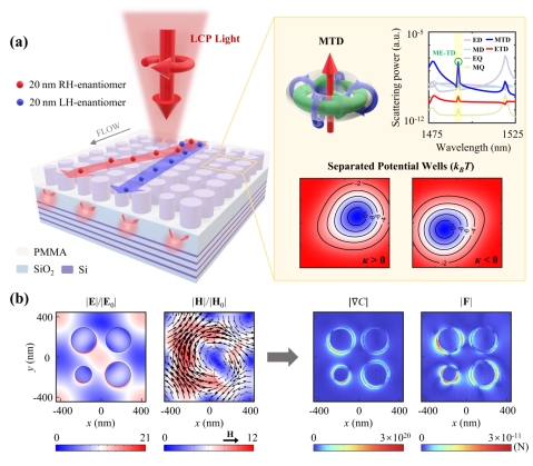 To address this, the team of professor Zhanshan Wang and Xinbin Cheng proposed a high-speed sorting method for nanoscale chiral particles by integrating enantioselective potential wells with a flow field. As illustrated in Figure 1, a mirror-enhanced toroidal dipole significantly amplifies the electromagnetic field above the metasurface, enhancing the chiral gradient force and thereby creating position-separated enantioselective potential wells. By introducing a fluid field to work in tandem with the enantioselective potential wells, a significant difference in the motion of the enantiomers is induced.