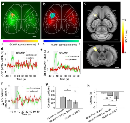 The joint team successfully captured neuronal signals (RCaMP1.07), astrocytic calcium signals (GCaMP6s), and BOLD signals in the contralateral forelimb somatosensory cortex of mildly anesthetized mice following electrical stimulation (Figure 2). Temporal analysis revealed a distinct delay in activation from neuronal → astrocytic → BOLD signals, elucidating the temporal transmission pathway of neurovascular coupling.