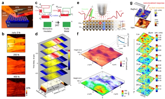 Figure 2: Probing nanoscale spatial heterogeneity using ultrafast s-SNOM. a–b, Spatiotemporal variations of plasmonic responses in graphene with different layer numbers. c–d, Correlation between the insulator-to-metal transition dynamics and spatial positions in VO₂ microcrystals under strong pump excitation. e–f, Exciton dynamics in a WSe₂/WS₂ heterostructure, correlated with the AFM topography. g, Study of many-body dynamics in perovskites under strong pump excitation.