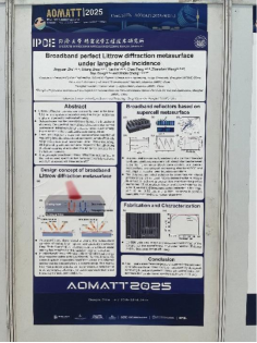此外,周思量同学与梁晓佳同学分别在墙报展示环节中展示了题为《Broadband perfect Littrow diffraction metasurface under large-angle incidence》和《Pixel-wise polarization integrated HgCdTe photodetectors》的研究成果,展现了课题组在先进光学制造方向的研究积累与创新思路。吴佳玮同学与张晓东同学也随队参会,认真聆听了多场大会报告与分会场交流,积极参与学术讨论,进一步拓展了科研视野,增强了对本领域前沿动态的理解。