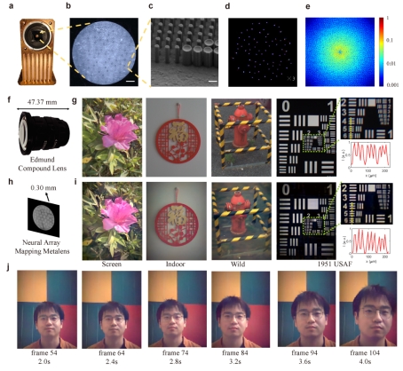 图2 神经阵列超构透镜成像系统成像性能测试。(a)原型机;(b)光学显微图;(c)扫描电子显微图;(d)系统的点扩散函数。(e)系统的MTF;(f) Edmund复合透镜。(g)使用Edmund复合透镜相机拍摄显示屏、室内场景、室外场景及分辨率测试图的成像效果。(h)神经阵列超构透镜成像系示意;(i)神经阵列超构透镜成像系统在相同条件下拍摄的图像;(j)实时视频成像过程中捕获的六帧序列及对应时间。