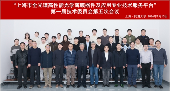 2026年1月13日,上海市全光谱高性能光学薄膜器件及应用专业技术服务平台(以下简称“平台”)第一届技术委员会第五次会议暨2025年度总结会议在同济大学沪西校区召开。技术委员会主任祝世宁院士(南京大学),吴健教授(华东师范大学)、张大伟教授(上海理工大学)、黎华研究员(中国科学院上海微系统与信息技术研究所)、李中亮正高级工程师(中国科学院上海高等研究院)、姜大朋正高级工程师(中国科学院上海硅酸盐研究所)、任宽副研究员(中国工程物理研究院激光聚变研究中心)、王立栓高级工程师(天津津航技术物理研究所)、王占山教授(同济大学)等委员出席会议,平台建设与运行团队成员参加会议。