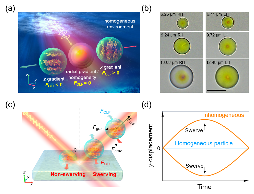 图1. 手性不均匀性诱导的自转向光力效应示意图。(a)不同手性梯度的颗粒在均匀线偏振光中产生方向相反的横向光力;(b)左右手性颗粒的显微图像;(c)分别置于界面中、表面和表面外的手性粒子上的不同横向光力的图示;(d)不均匀颗粒在光场中旋转时自发转向,而均匀颗粒不受横向光力。