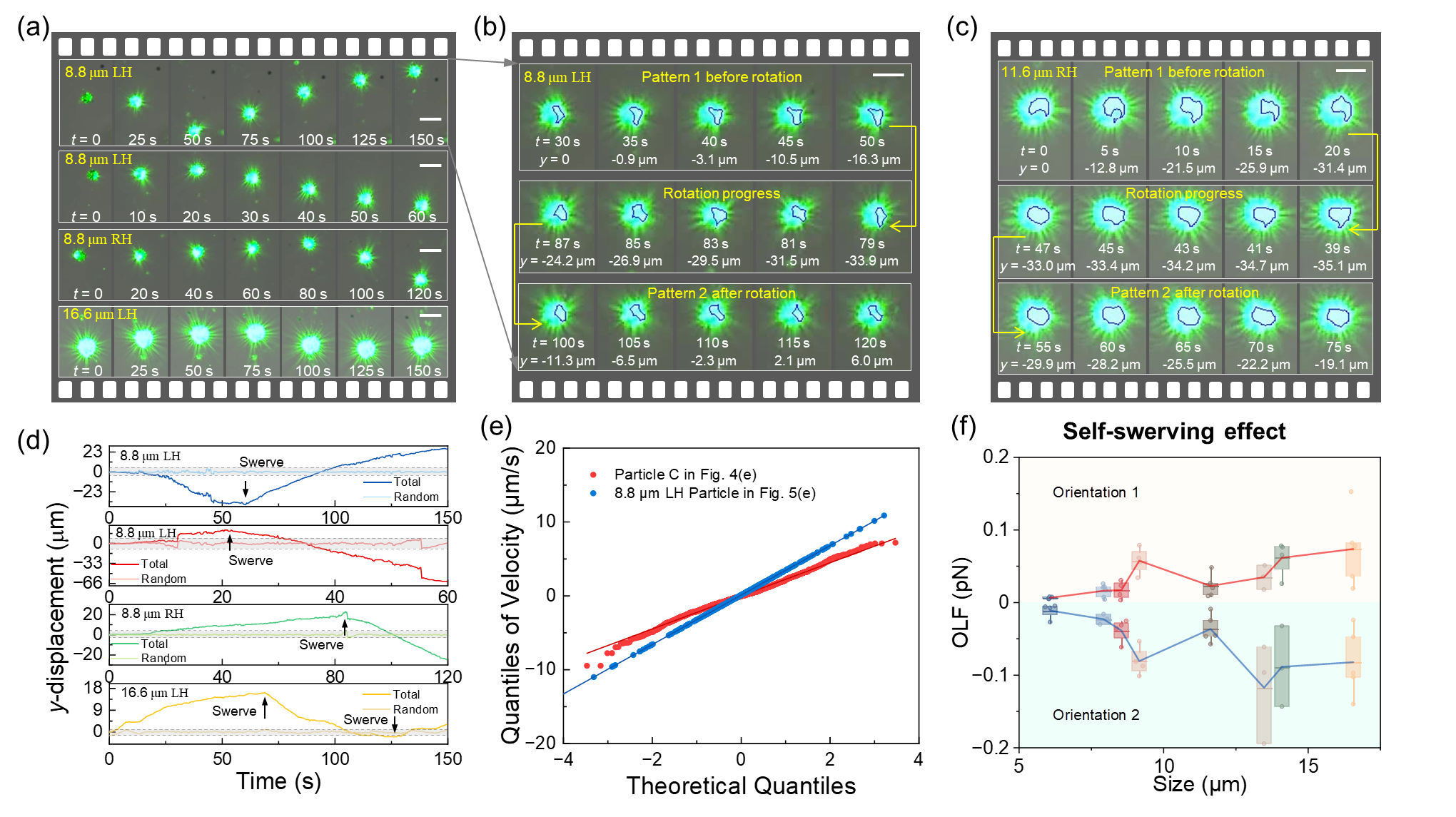 图2. 微米级手性颗粒在实验中的自切换行为观测。(a)颗粒在s偏振光下表现出双向运动;(b-c)颗粒旋转过程中散射图案动态变化,反映其取向变化;(d)运动轨迹清晰显示自切换效应;(e)速度分布符合热噪声统计特征;(f)不同尺寸颗粒均观测到正负交替的横向光力。