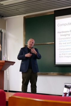 近年来在小型化、轻量化、低成本等工程化需求以及光谱成像、深度相机景深扩展、超快成像等应用需求的驱动下,计算成像引起了越来越多研究兴趣。讲座以端到端“深度光学”系统的开发为主线展开讨论,内容涵盖单片DOE成像,消色差景深扩展等内容。阐明端到端设计的三个基本要素:光学系统的可微分仿真模型,避免局部最小值找到全局最优的优化方法,适用于特定复原任务的神经网络结构。Wolfgang Heidrich教授对其课题组近期的工作“制造感知设计”进行介绍,该技术为“深度光学”系统的工程化应用提供支撑。此外教授介绍了如何使用生成模型的能力来设计需要非常低硬件资源的特定应用的成像系统。