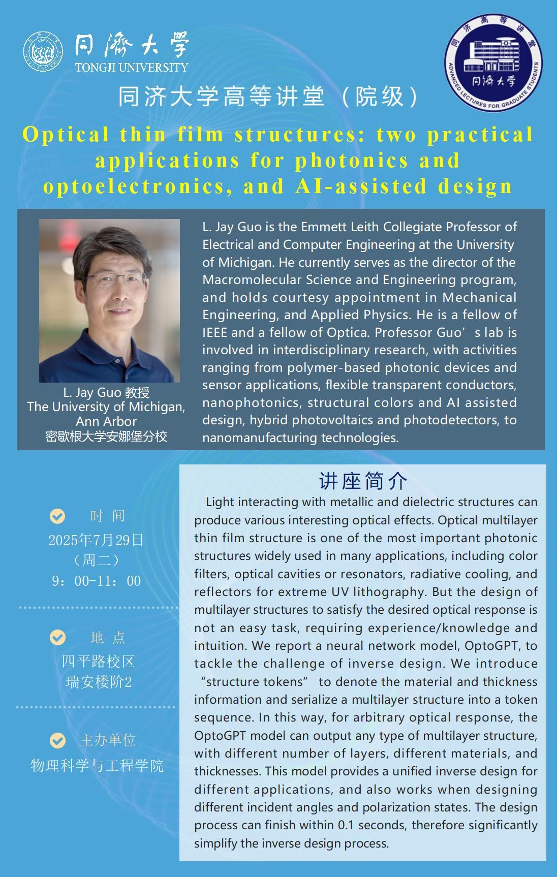 【学术报告】L. Jay Guo:Optical thin film structures: two practical applications for photonics and optoelectronics, and AI-assisted design