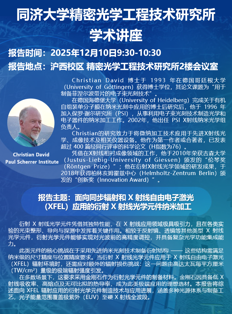 【学术报告】Christian David:面向同步辐射和X射线自由电子激光(XFEL)应用的衍射X射线光学元件纳米加工