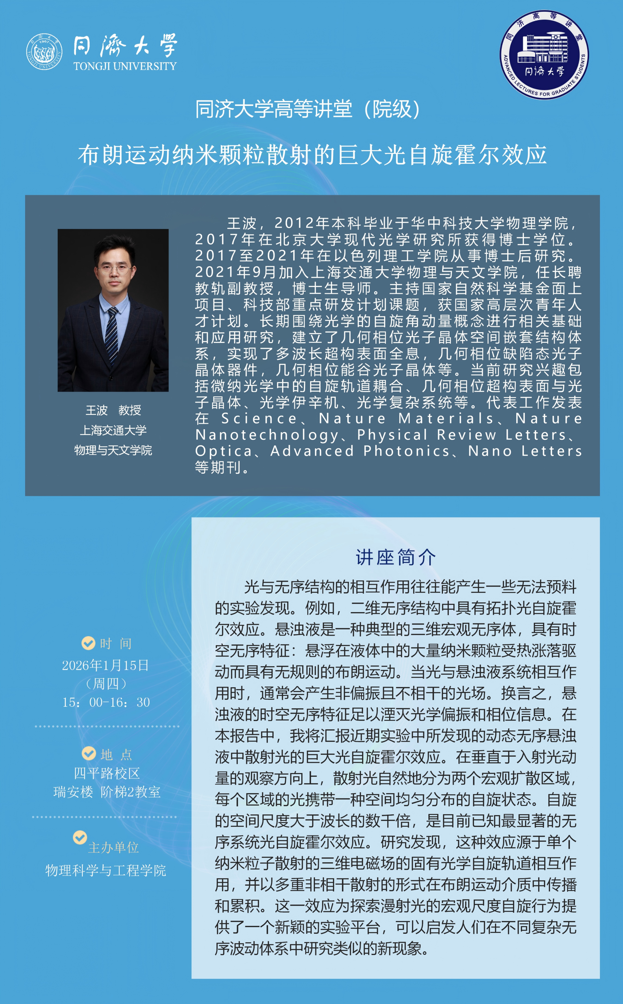 【学术报告·高等讲堂】王波:布朗运动纳米颗粒散射的巨大光自旋霍尔效应