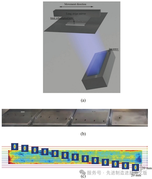 图3 (a)单轴IBF设备示意图(b)用于生成椭圆束斑的掩模孔组照片(c)椭圆束斑扫描线的加工示意图