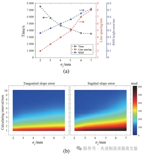 图2 不同弧矢宽度椭圆高斯束斑下的模拟结果:子午σ = 2 mm,弧矢σ = 2–7 mm;(a)总蚀刻时间、线间距与残余RMS高度误差的变化;(b)不同弧矢宽度下残余子午与弧矢斜率误差