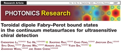 近日,同济大学物理科学与工程学院王占山教授、程鑫彬教授团队在手性检测领域取得重要进展。研究团队提出了一种基于“环形偶极子法布里-珀罗连续域束缚态共振(TD FP-BIC)“的新型超构表面,实现了对手性分子的超高灵敏度检测。相关成果以“Toroidal dipole Fabry-Perot bound states in the continuum metasurfaces for ultrasensitive chiral detection”为题,发表于《光子学研究》(Photonics Research)。