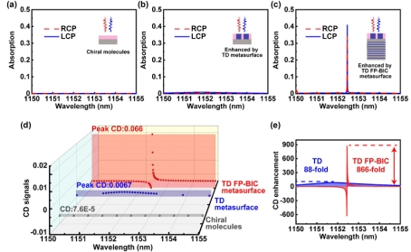 该工作充分利用TD FP-BIC的场束缚特性,构建了理想的光学手性场,弥补了现有CD光谱探测灵敏度低的不足。研究成果不仅为手性分子单分子级别检测奠定了理论与技术基础,也为发展新型手性光子器件提供了新的思路。