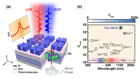 手性是自然界普遍存在的重要特性,在食品安全、药物研发、临床诊断和材料科学等领域具有重要应用价值。圆二色(CD)光谱作为目前最常见的手性探测手段,其利用手性物质对左/右旋圆偏振光的差分吸收来表征物质手性的大小。然而,由于手性分子与探测波长存在尺寸失配,其CD信号通常远弱于分子自身吸收信号,导致检测灵敏度严重受限。