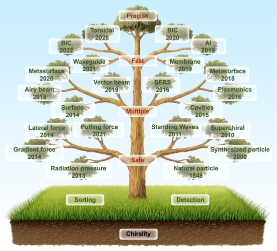 手性是自然界中普遍存在的一类几何与物理属性,在食品安全、药物研发、临床诊断和材料科学等领域具有重要应用价值。尽管一对手性异构体在化学组成上完全相同,但其空间构型的微小差异却可能导致截然不同的生物活性与药理效应。因此,如何对手性分子进行高灵敏、非破坏性的分选与检测,始终是化学、生命科学和材料科学领域面临的核心挑战。传统的手性分析方法主要依赖化学衍生、生化反应或色谱分离等非光学手段。这类方法虽然技术体系较为成熟,但通常存在操作流程复杂、样品消耗大、实时性不足等局限。相比之下,基于光与物质相互作用的光学方法具有非接触、非破坏和易于集成等优势,正逐步成为手性研究领域的重要发展方向。