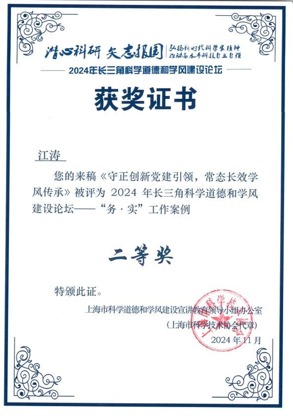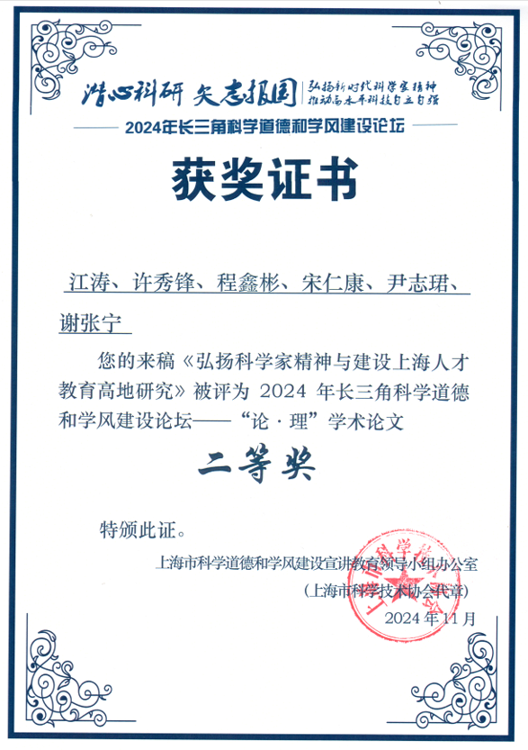 2024年11月9日举办的“潜心科研 矢志报国——弘扬新时代科学家精神,推动高水平科技自立自强”2024年长三角科学道德和学风建设论坛在上海理工大学大礼堂隆重召开,我院师生混合第十党支部宋仁康同志作为学生代表参加了“论·理”学术论文颁奖典礼。